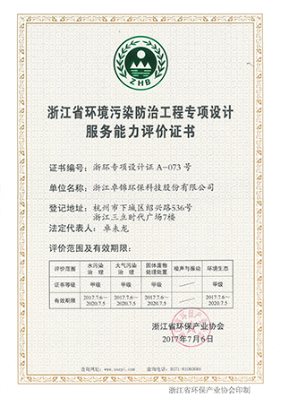 浙江省環(huán)境污染防治工程專項(xiàng)設(shè)計(jì)服務(wù)能力評(píng)價(jià)證書
