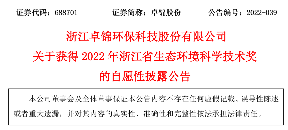 附件:關(guān)于獲得2022年浙江省生態(tài)環(huán)境科學(xué)技術(shù)獎(jiǎng)的自愿性披露公告