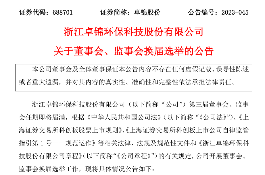 附件:浙江卓錦環(huán)??萍脊煞萦邢薰娟P(guān)于董事會(huì)、監(jiān)事會(huì)換屆選舉的公告