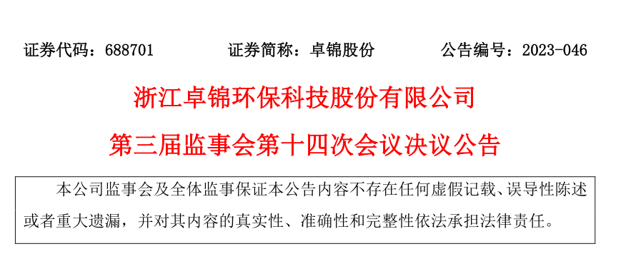 浙江卓錦環(huán)??萍脊煞萦邢薰镜谌龑帽O(jiān)事會第十四次會議決議公告