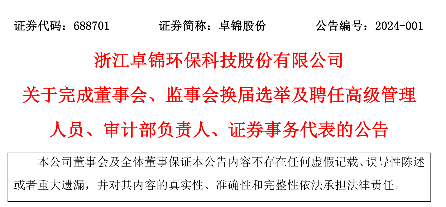 附件:浙江卓錦環(huán)??萍脊煞萦邢薰娟P(guān)于完成董事會、監(jiān)事會換屆選舉及聘任高級管理人員、審計部負責(zé)人、證券事務(wù)代表的公告