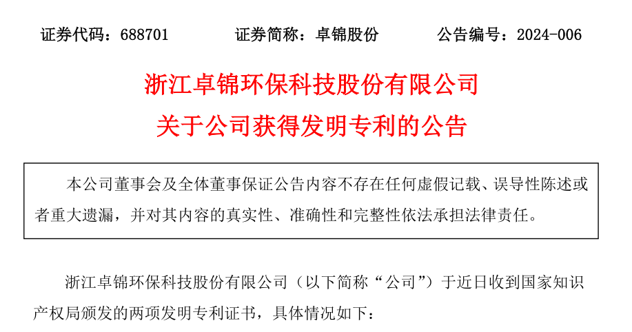 附件:浙江卓錦環(huán)??萍脊煞萦邢薰娟P(guān)于公司獲得發(fā)明專利的公告