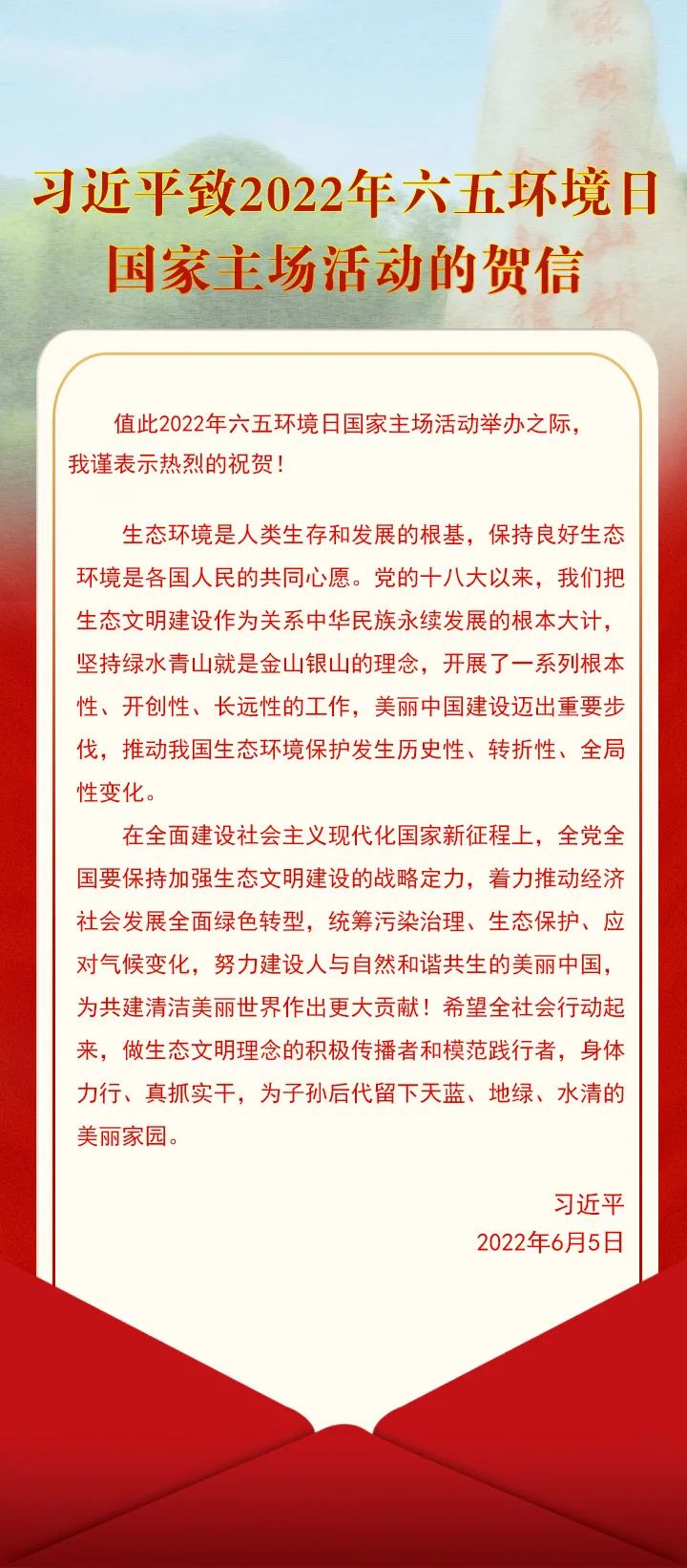 2022年六五環(huán)境日國家主場活動5日在遼寧省沈陽市舉行。中共中央總書記、國家主席、中央軍委主席習(xí)近平發(fā)來賀信,向活動的舉辦表示熱烈的祝賀。